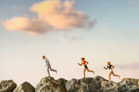 Miniature people : Running on rock cliff with nature background , Health And lifestyle concepts