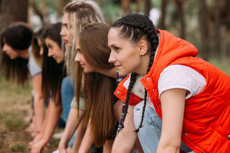 Low start leisure activity, women competitions concept. Sport game on the nature.