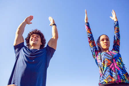 Side view of young couple doing warm up exercise outdoors on terrace, sport and healthy lifestyle concept.