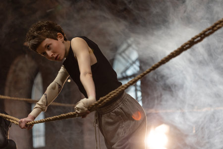 A woman in a boxing gym, portrait by the ropes, ready to fight, cinematic style photo, soft lighting, dark hall