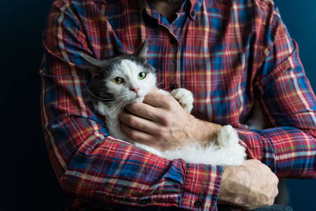 Cat in the arms of the owner. A white-gray cat is resting in the arms of a man. Emotions of love, tenderness, care