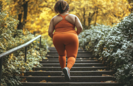 An overweight woman going up the stairs in the park.