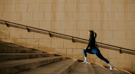A woman performs lunges on steps. She focuses on her workout routine. The bright sun provides good light for exercise. This scene captures a moment of physical activity outdoors.