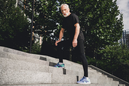 Energetic senior man in sportwear climbs outdoor stairs during urban park workout in city day