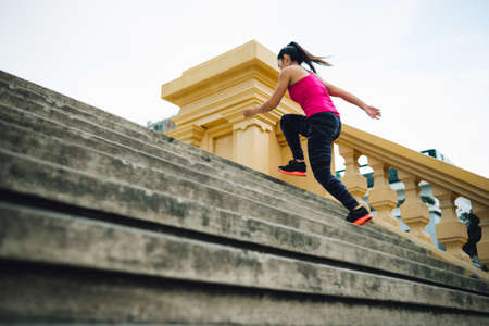 Attractive sporty woman running on the stairs and working out with cardio exercises outdoors
