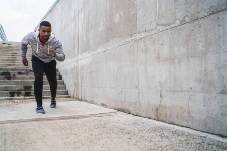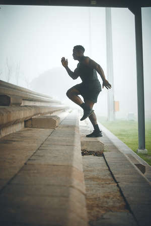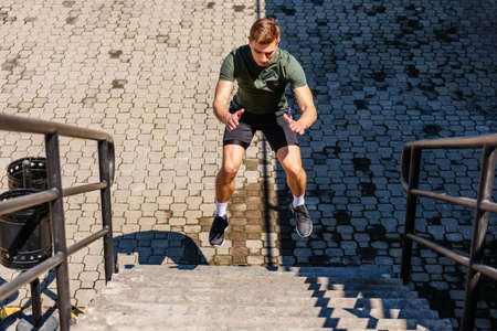 Young man athlete training on a stadium. Jumping upstairs on staircase and warming up before run. Wearing casual sportswear. Central composition