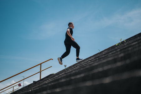 Athletic man running up stairs outdoors under a clear blue sky