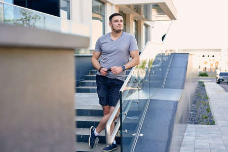 Young athlete man runner running up and down on city stairs in summer on morning run, background urban city street. Sports training. Fitness cardio workout in fresh air, walk outside.