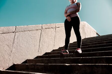 Closeup photo of athlete girl's legs dressed in sportswear with sneakers going up stairs outside in city abandoned stadium . Happy young female sport, travelling, ecology, healthy lifestyle concept