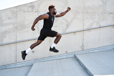 Focused young runner with cornrows jogging upstairs