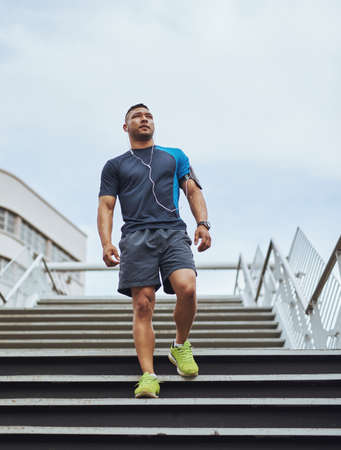 Building his stamina with some stair sprints. Cropped shot of a sporty young man running up steps.