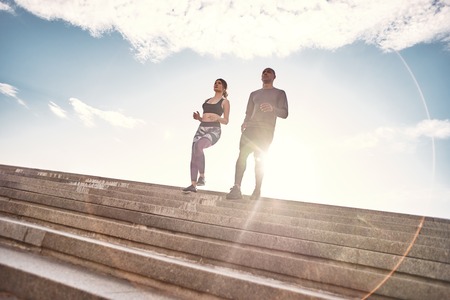Training together is fun. Full length portrait of cute and young interracial couple in sportswear running down stairs against sunny and clear sky. Common hobbies