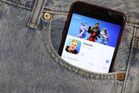 Los Angeles, California, USA - 5 December 2019: Fortnite game app icon on phone screen in blue jeans pocket. App Store logo on Iphone with light denim Background, Illustrative Editorial.