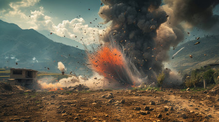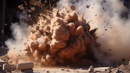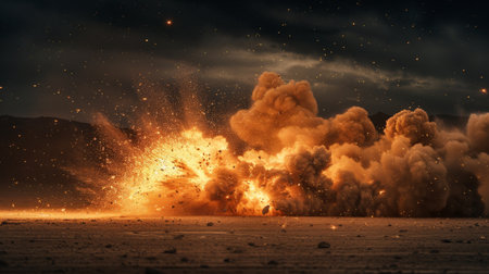An intense explosion erupts generating a large cloud of dust and debris against a dark background illustrating the force of the blast and its impact on the environment.