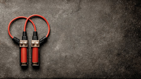 Red and black battery charger cables are neatly arranged on a dark textured surface, providing an organized view for charging devices efficiently.