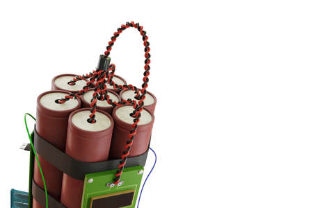 Dynamite sticks with time igniter. Explosive material with ignition connected to a mobile phone. White background.