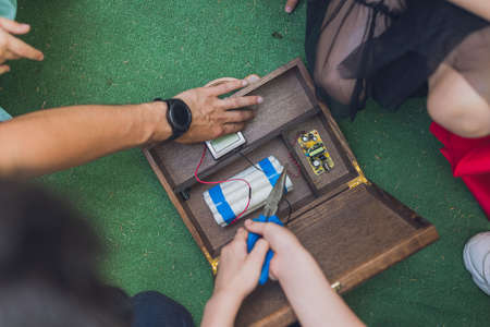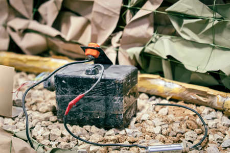 Terrorist bomb made at home with remote controlled detonator and lot of cables. Prepare to terorist act.