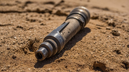 A metallic cylindrical object lies on coarse sand, seemingly abandoned. Its design hints at a functional tool or part of machinery, suggesting previous use in a rugged environment.