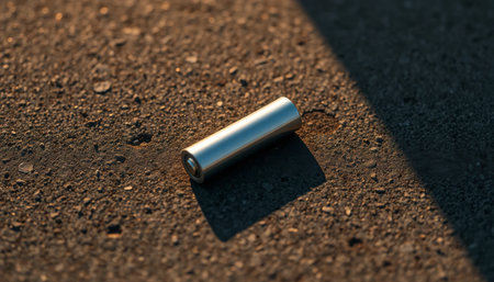 Lithium Battery on Asphalt. AA lithium battery laying on rough asphalt ground in warm sunlight, casting a long shadow.