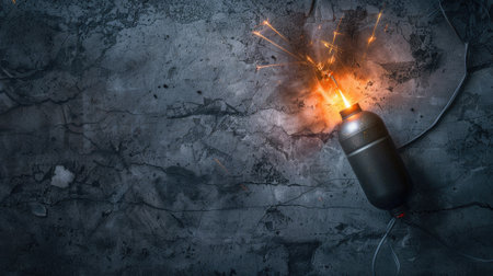 Old-fashioned black bomb with a lit fuse on a gray table, top view. Perfect for stock images evoking a sense of wartime history and security risk. Space for text
