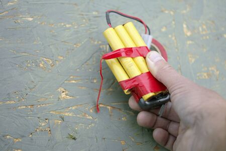 Terrorist is holding home made bomb with cables and remote controled detonator. Preparation for terrorist acts.