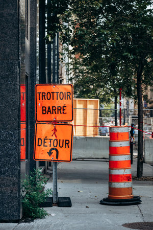 Montreal, Canada - August 14, 2025: downtown construction detour signs in French on Rue Saint-Antoine Ouest