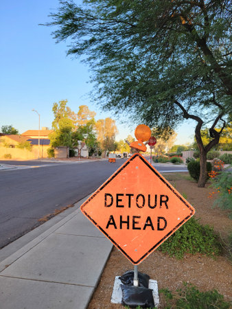 Bright diamond-shaped traffic sign with a light on its top set near crossroad and notifying about Detour Ahead, Phoenix, Arizona
