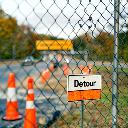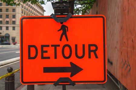 A vivid detour sign stands prominently against a clear blue sky, indicating a road diversion in an urban setting with construction barriers visible.