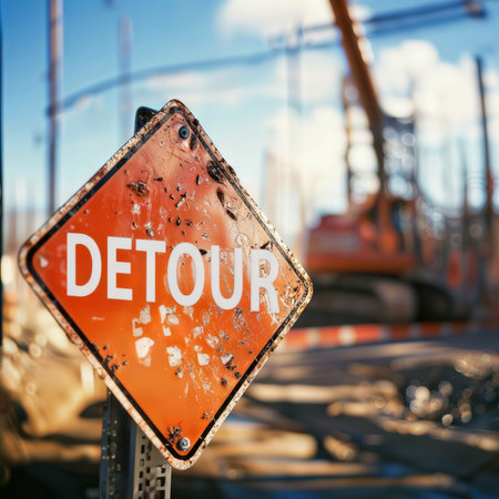 Detour Ahead. A weathered detour sign stands against a construction site backdrop.