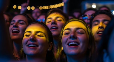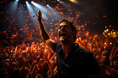 Cheerful concert audience, hands up, confetti falling, bright stage lights