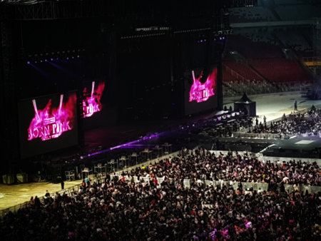 Jakarta, Indonesia on March 2023. The atmosphere of blackpink's concert in Jakarta, Born in Pink. The ambience of pink lights dominated, very crowded, exciting and fun.