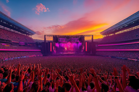 A vibrant concert at a packed arena with dramatic lighting, electric atmosphere, and enthusiastic fans enjoying the performance. Generative AI