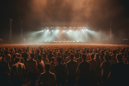 Stage lights and crowd of audience with hands raised at a music festival. Fans enjoying the party vibes.