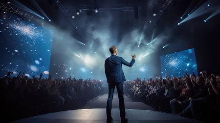 Nightclub stage lit up, fans dancing joyfully generated by artificial intelligence