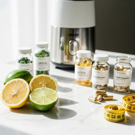 Lime, lemon, measuring tape and bottles of vitamin supplements on white background