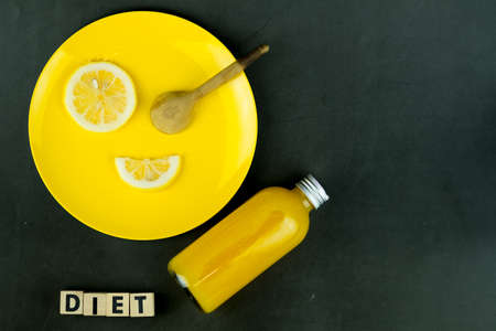 Bottle of fresh orange juice with slice fresh lemon on yellow plate. Creative food or diet food and creative pic