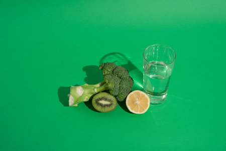 Broccoli, kiwi and lemon with glass of water with green background representing healthy diet