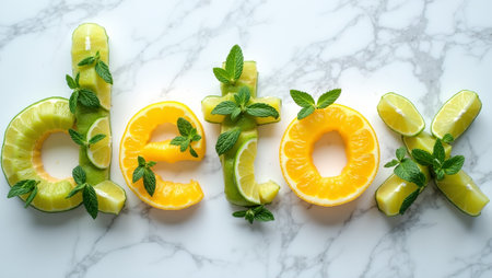 Citrus fruits and mint leaves spell detox on marble