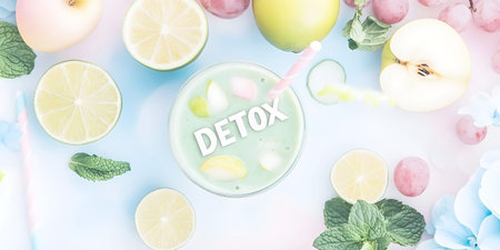 Detox word made from microgreens is surrounded by fresh green apples, limes, basil and mint leaves, forming a vibrant and healthy composition promoting wellness and cleansing