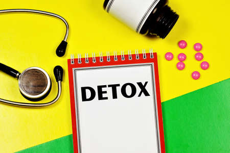 Detox-text label on the medical folder. The diagnosis was made by a doctor. Medication treatment.