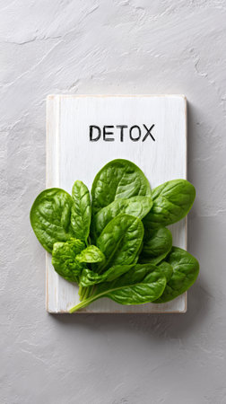 Green spinach leaves scattered across rustic white wooden surface, highlighting wellness concept with handwritten detox text, emphasizing natural health approach