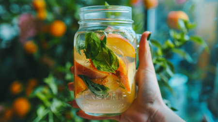 A hand holding a mason jar filled with peach and basil-infused water, showcasing a simple yet flavorful hydration option