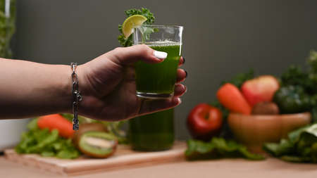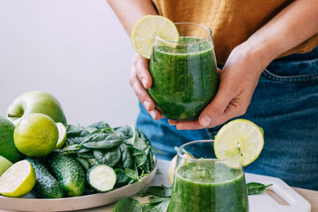 Female hands hold a glass of freshly made green smoothie, selective focus, copy space. Vegetarianism