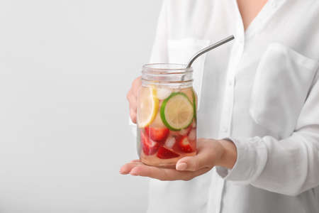 Woman with fresh strawberry lemonade on light background