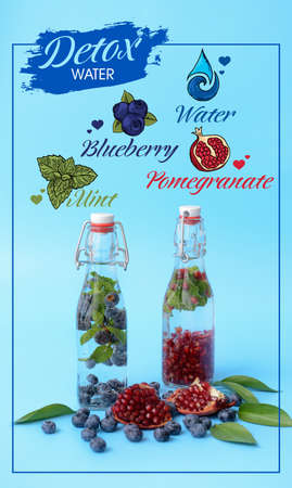 Bottles of fresh detox water and ingredients on blue background
