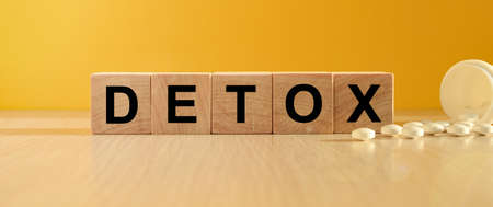Wooden cubes with the inscription DETOX with a bright yellow background and scattered tablets. Medical concept