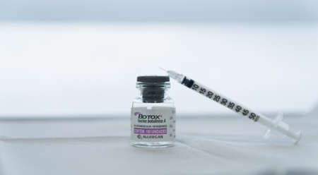 Porto Alegre, Brazil, April 10 - 2021: Botox glass medicine bottle, Syringe of botulinum toxin, hualuronic, collagen or flu on a white background