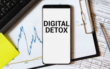 Hands holding a mobile phone with Digital Detoxing text on the screen. Digital Detox Concept