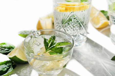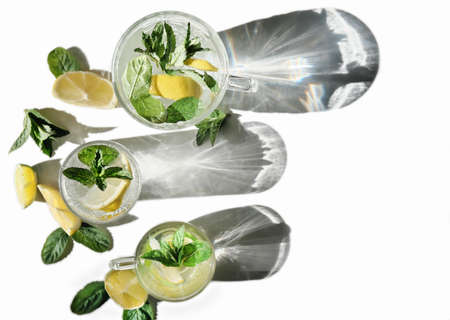 top view of summer fresh drink with lemon, mint and lime on white background, isolated. cool infused water for seasonal hot weather. shadows and sun reflects.