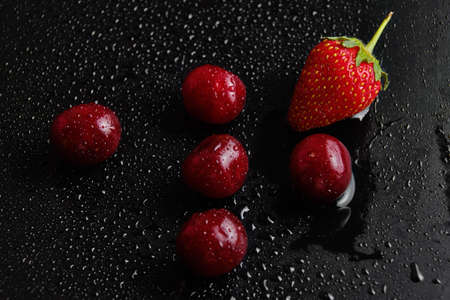 Sweet cherries with strawberries in drops of water
